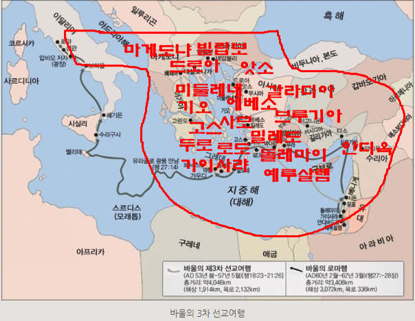 이 밖에도 바울은 마게도냐와 아가야 지역, 고리도 지역(고리도 전, 후서에서 떠로 언급) 마케도니아 지역에서의 3차 선교 여행을 통하여 고난과 시련을 겪으며, 그곳에 세운 교회를 굳건히 하고 사람들을 교육하고, 지도자들을 세우며 에수 그리스도의 복음을 전파하며 교회를 강건하게 하였다. 아멘~