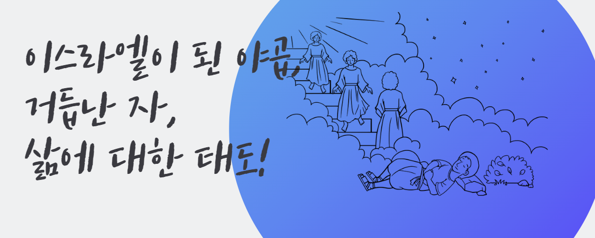 야곱은 아브라함의 손자이며, 그의 아들들은 이스라엘의 12지파가 되었다. 창세기(Genesis)를 기록을 통하여 상세하게 알 수 있다. 쌍둥이 형이 에서이며 어머니는 리브가(Rebecca)이다. 형에서(Esau)의 장자권을 어머니 리브가의 권유에 의하여 속임수를 써서 빼앗아 이삭(Issac)의 축복을 가로챈다. 이 때문에 야곱을 교활한 성격처럼 곧잘 묘사되나 그 또한 하나님의 예정이며 에서의 성격에서 나타나는 삶의 태도를 보지 못한 탓 아닌가 하는 생각이 든다. 가나안 여인들과 사귀며 가나안 여인을 아내로 들이고 그로 인하여 집안에 우상을 끌여들인 가나안 여인들로 인해 괴로운 사라의 삶을 본다면 사라가 야곱에게 장자권을 넘겨주도록 계략을 낸 사라의 심정을 이해할 수 있을 것이다.